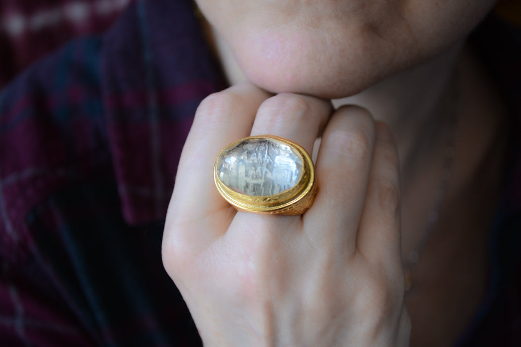 We added a clear crystal window to our reproduction Roman coin ring. Clear crystal enhances the details of the rhodium plated coin, lends extra dimension, and visual interest.