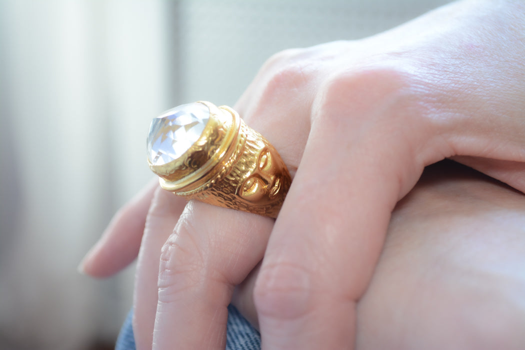 Buddha, and woman’s face embossed on each side make this ring extra special and unique.