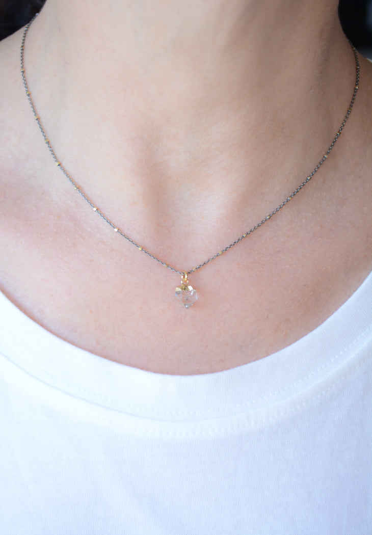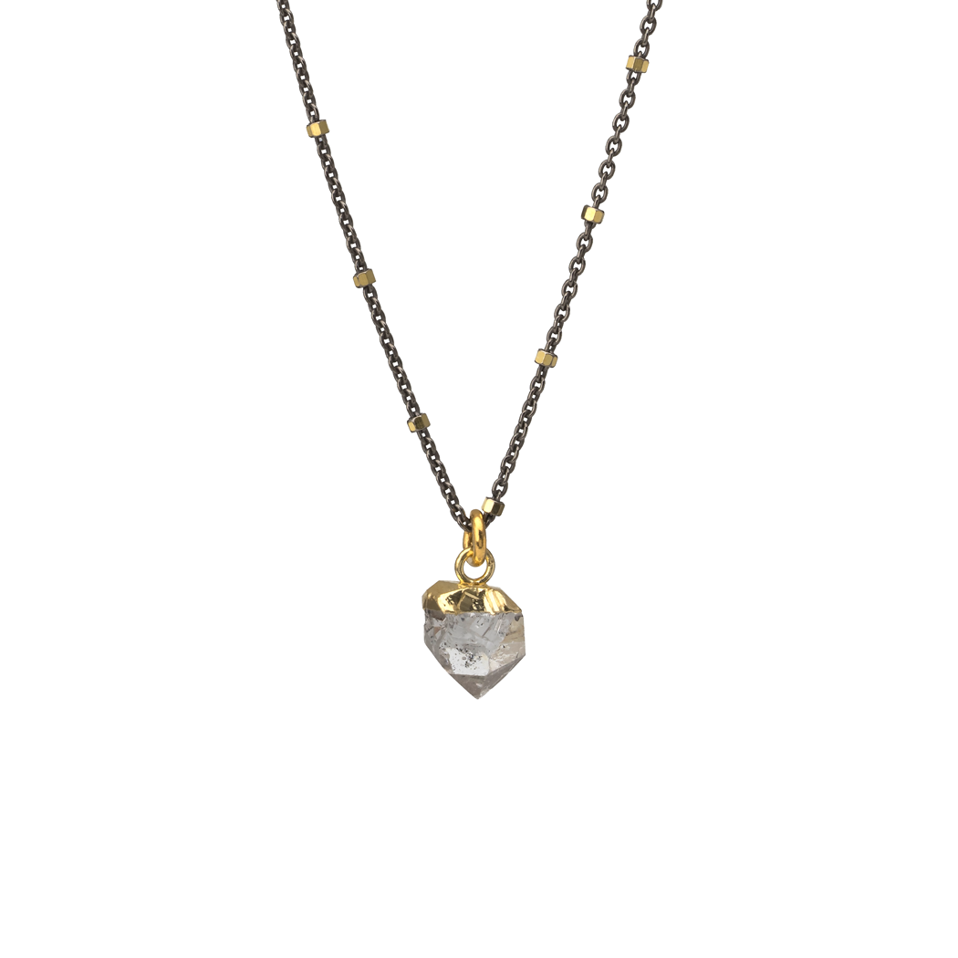 This necklace features a Sterling Silver chain that is dark rhodium plated, with 22kt gold plating. It is complemented by a rough-cut Herkimer Diamond pendant that is approximately 1/2″ long, suspended on an adjustable 16-18″ chain.