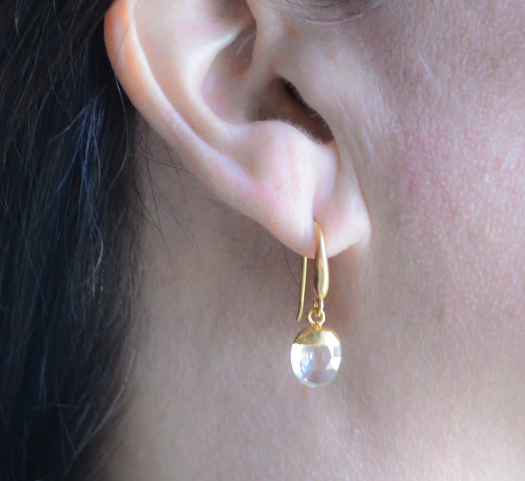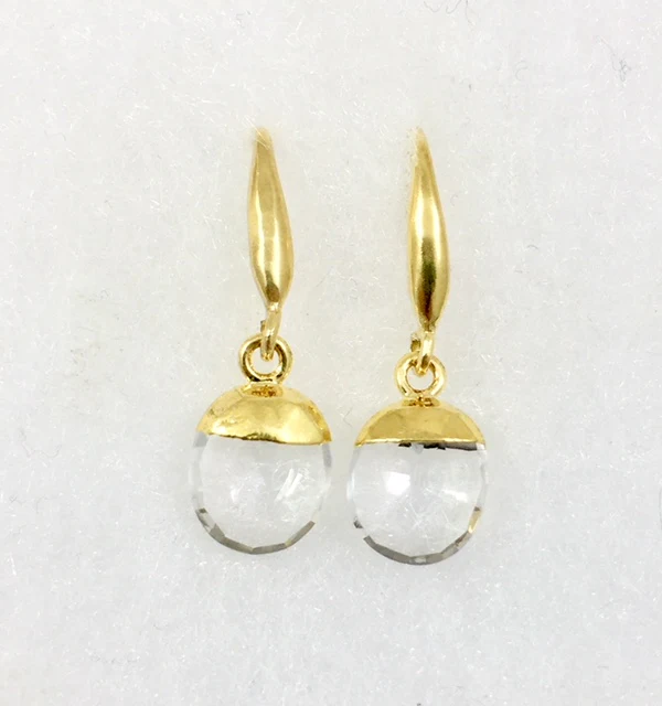 These faceted crystal quartz drop earrings feature a 22kt gold plated brass ear-wire. They are feather-light in weight and measure 1″ in length.