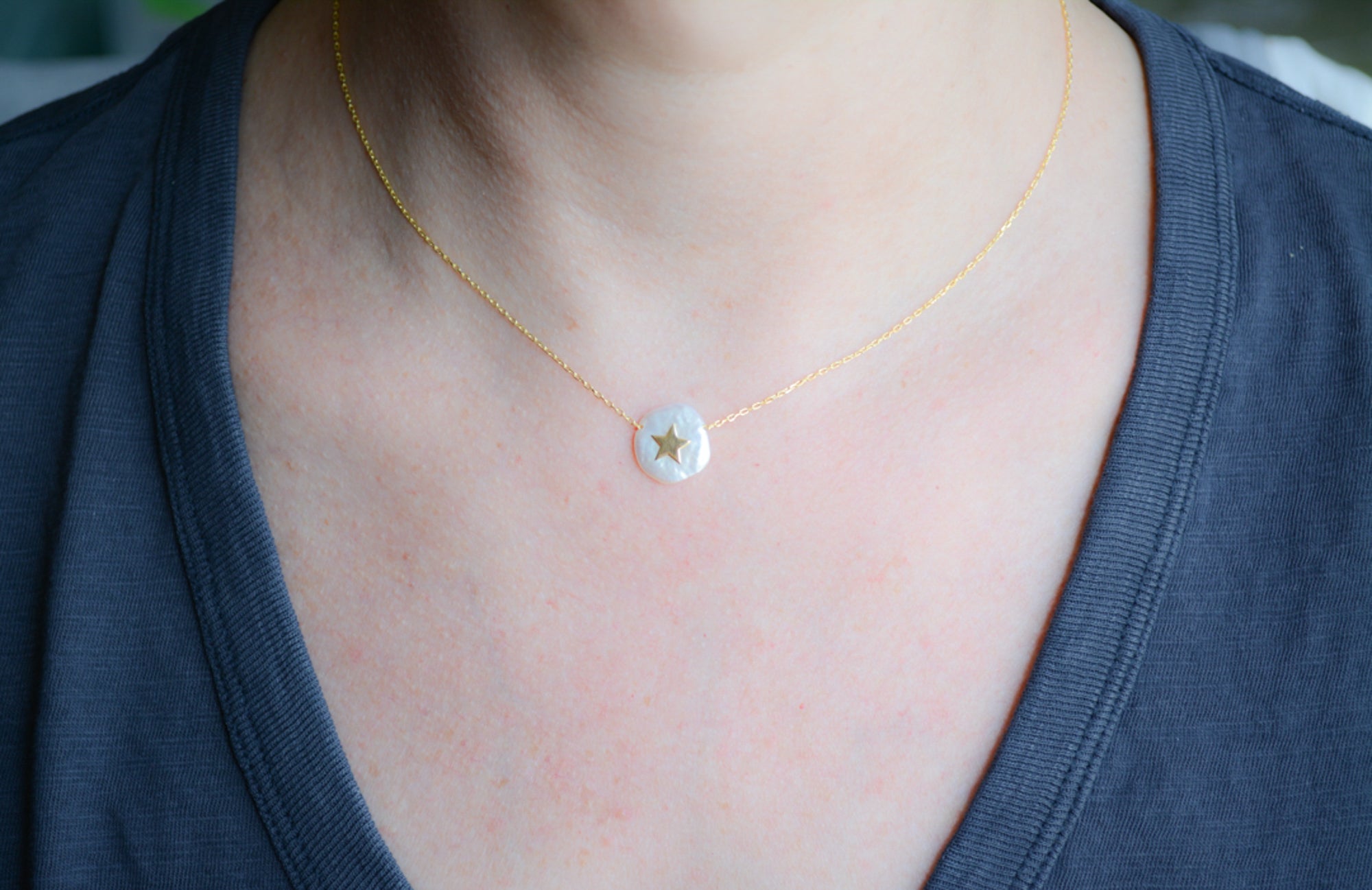 This freshwater pearl necklace is crafted with electroplated 22 karat gold over 925 sterling silver. The length is 16 inches with an additional 2 inches.