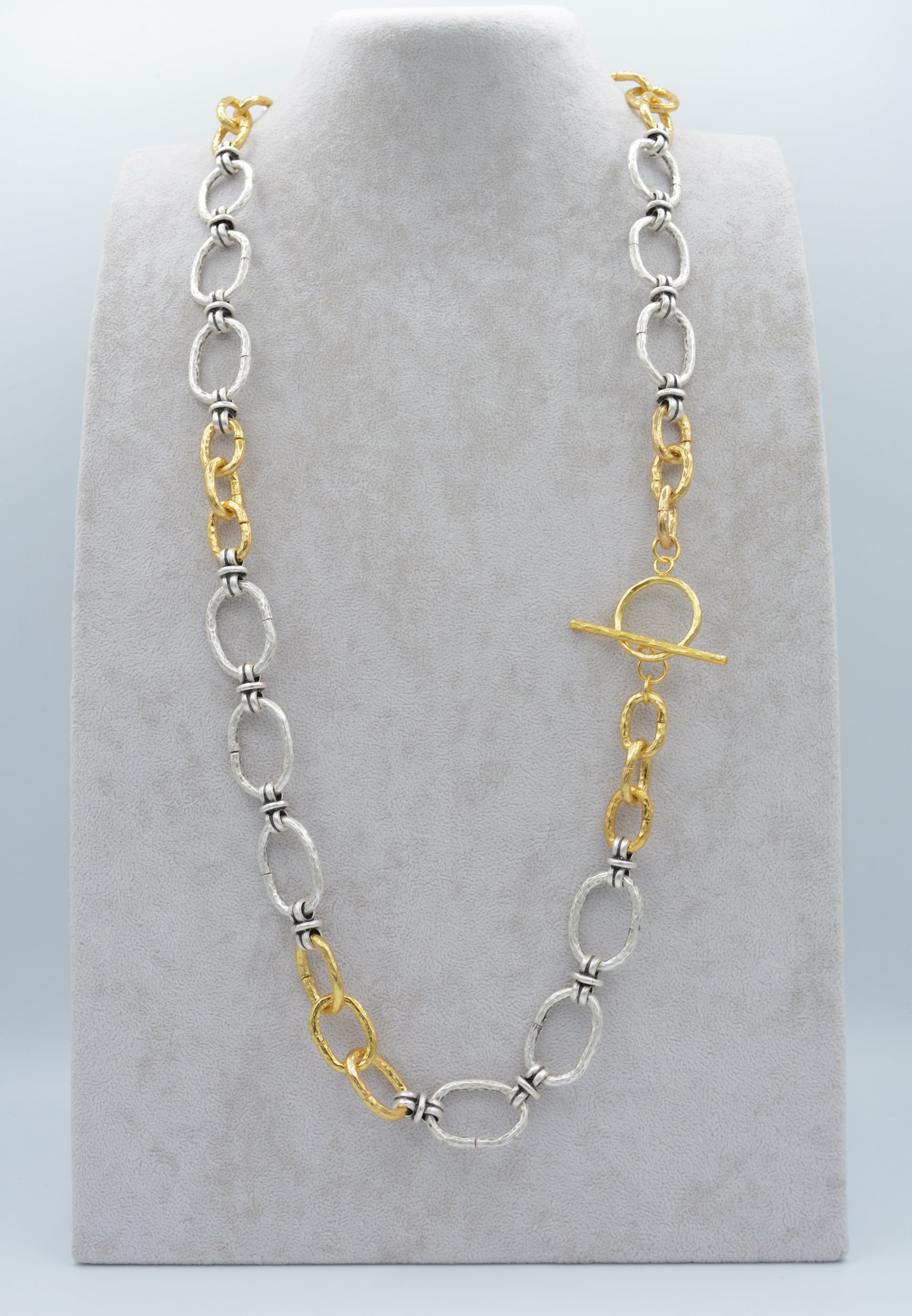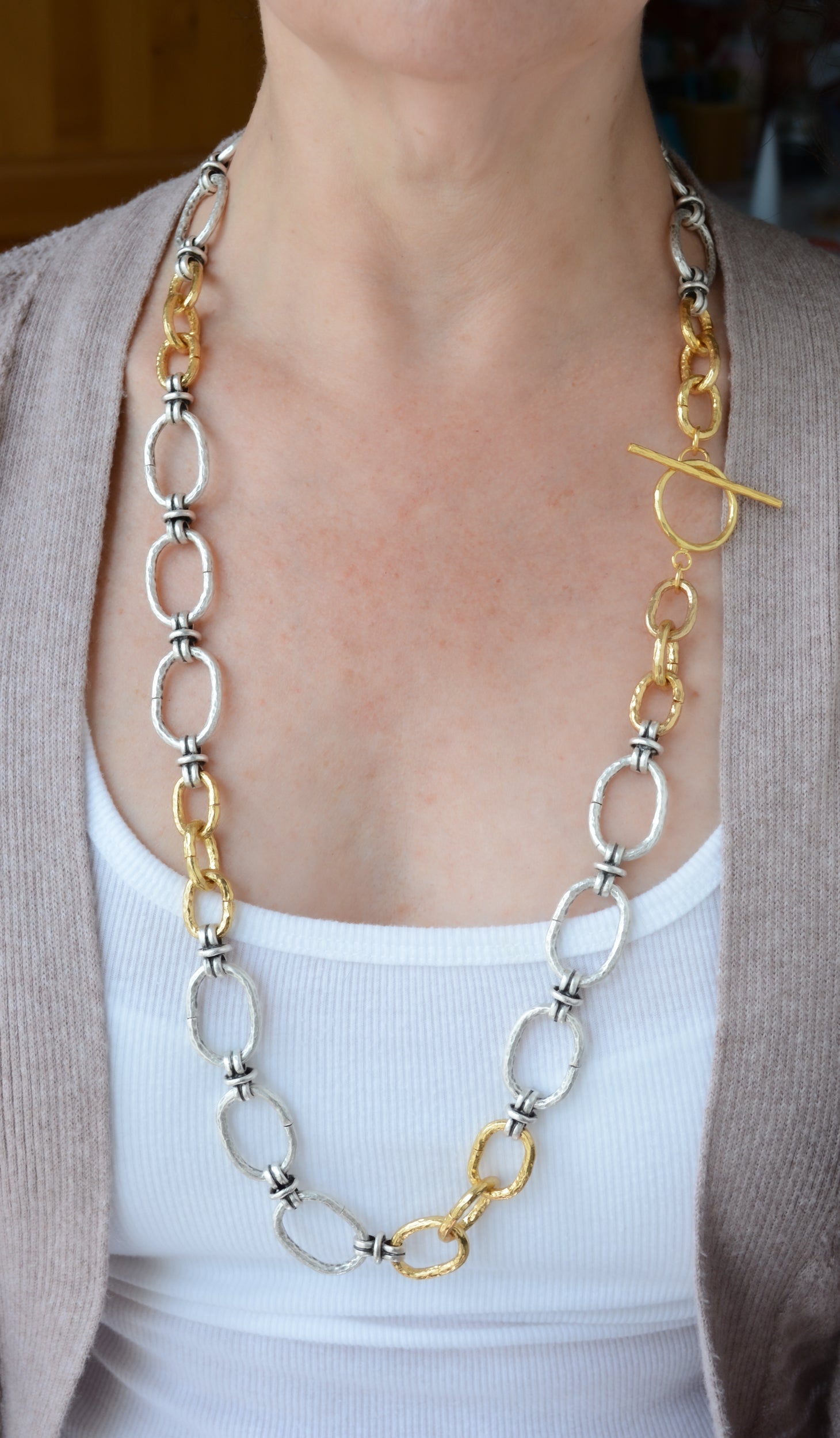 This versatile necklace looks great with silver or gold jewelry. Handmade chain is made with brass and plated with 22kt gold ,and lightly oxidized rhodium. We like to wear it with the toggle off center. 32″ long.
