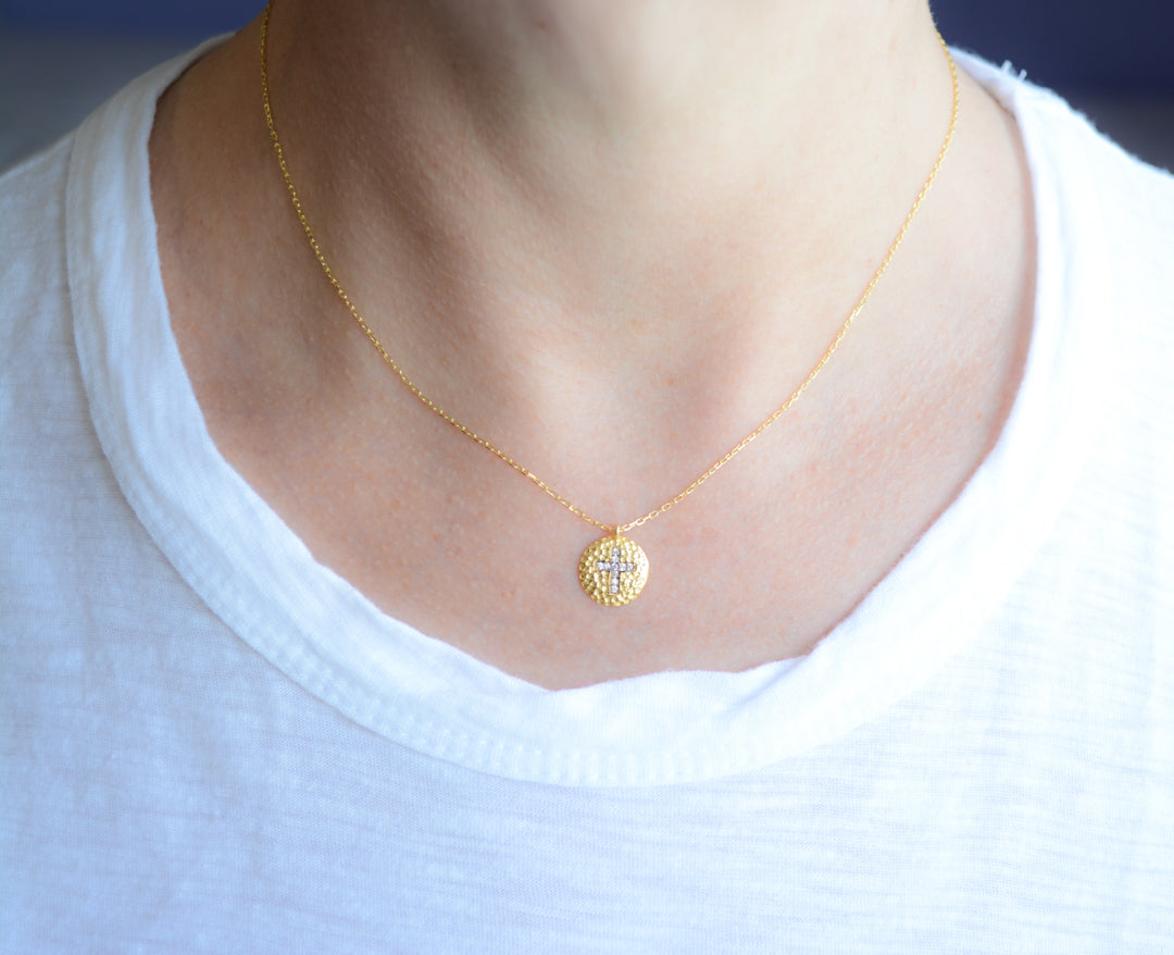 This gold-plated cross necklace features cubic zirconia accents and measures 1/2″ in diameter, with an adjustable chain of 16-18″ length.