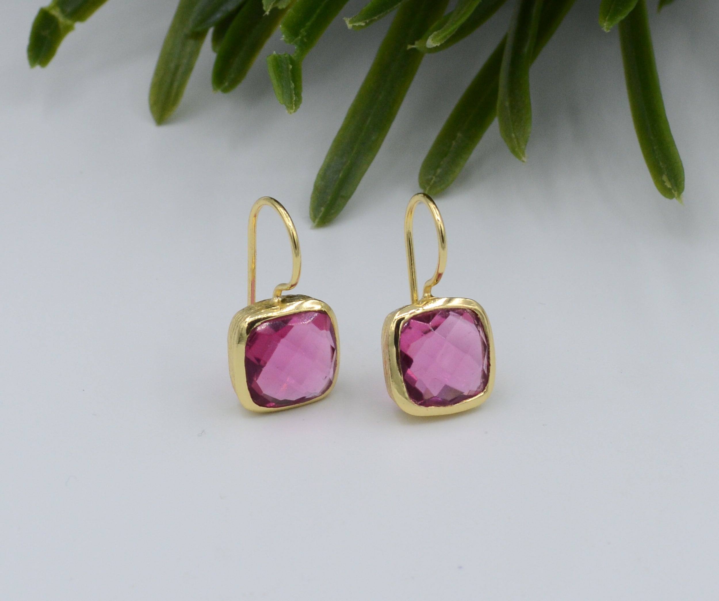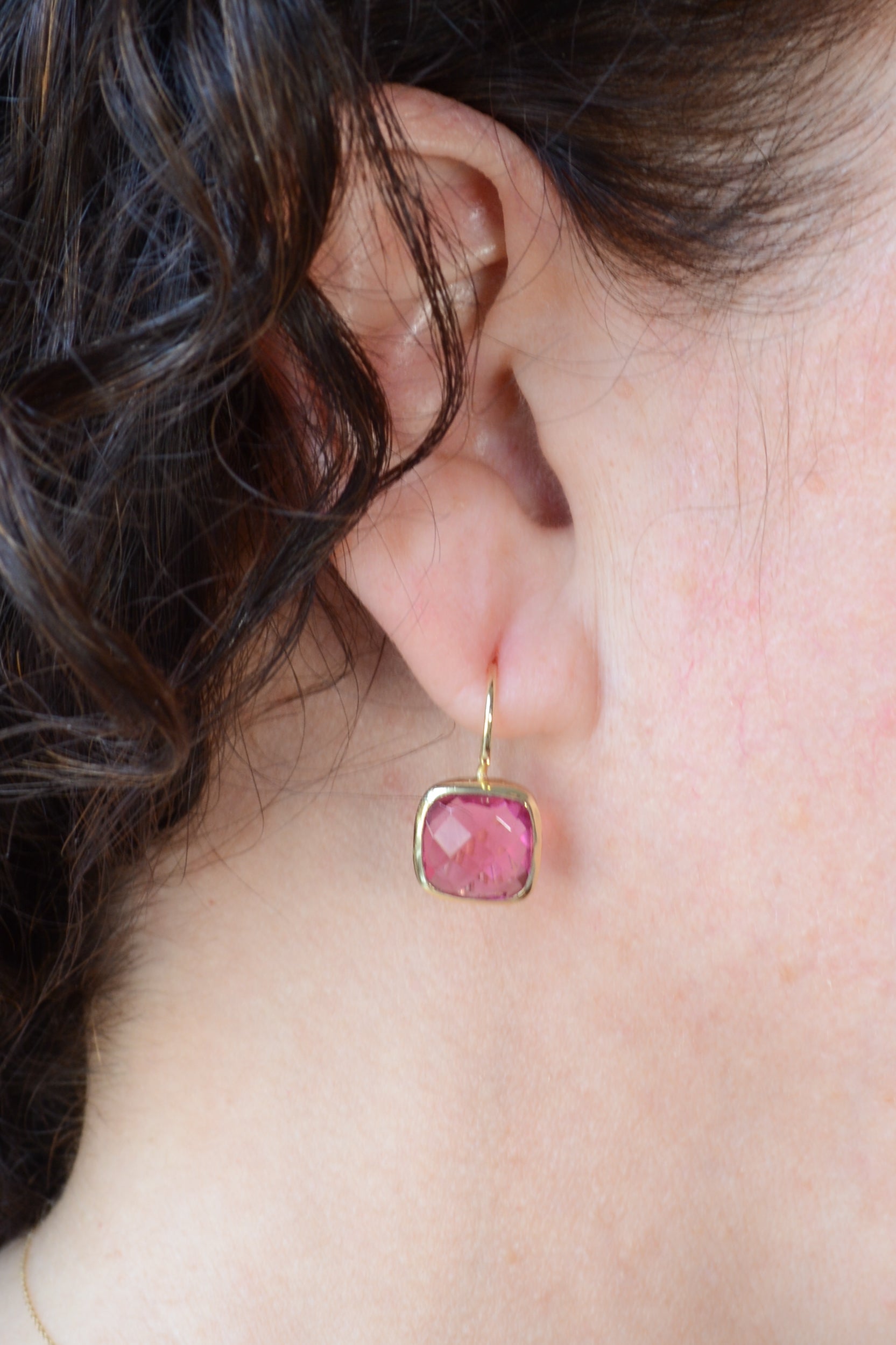 Faceted cushion cut pink tourmaline hydro earrings featuring 22k gold plating set in brass. These earrings boast a stunning hue that pairs perfectly with any ensemble throughout the year. Measuring 1/20″ in length.