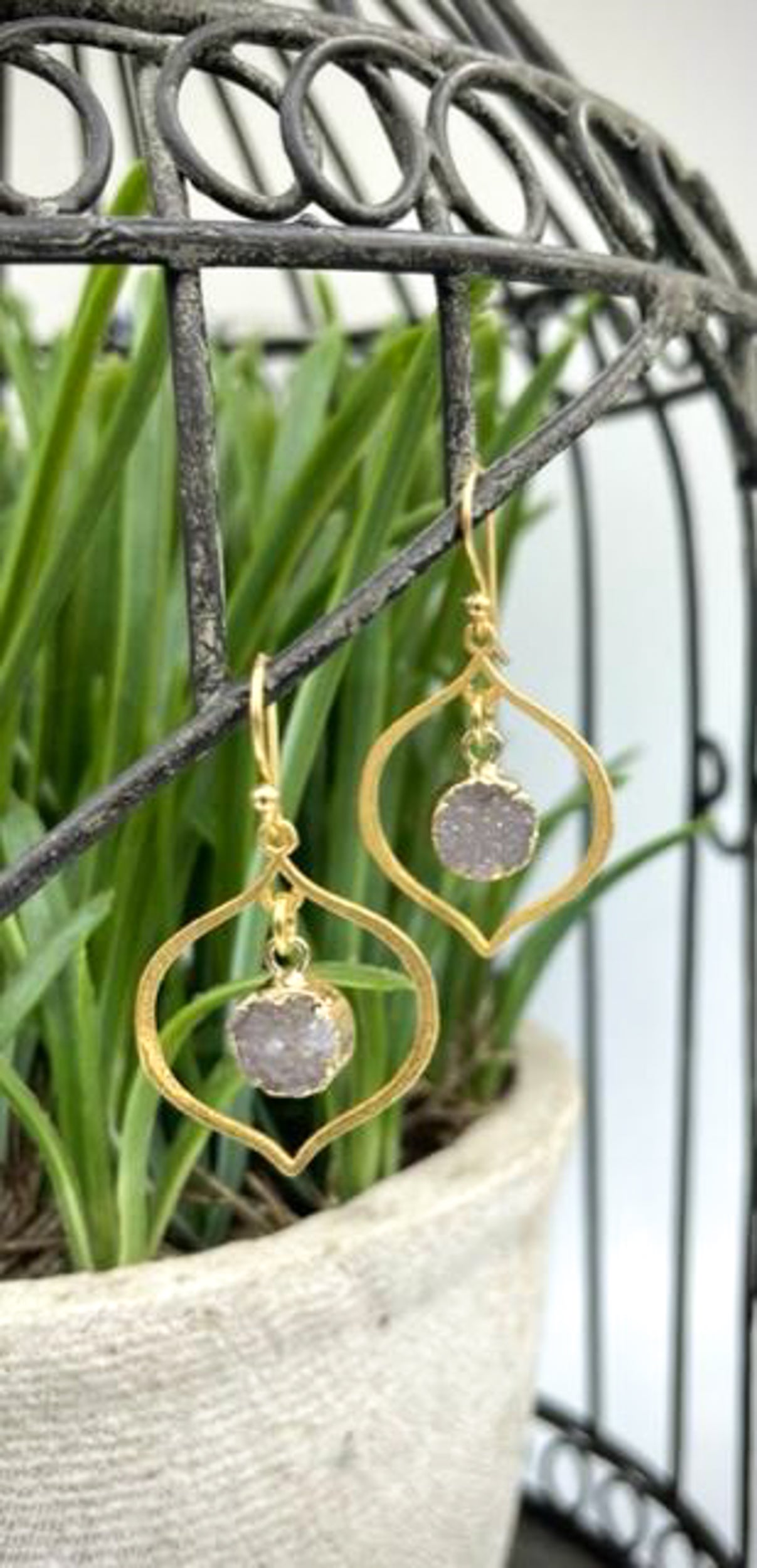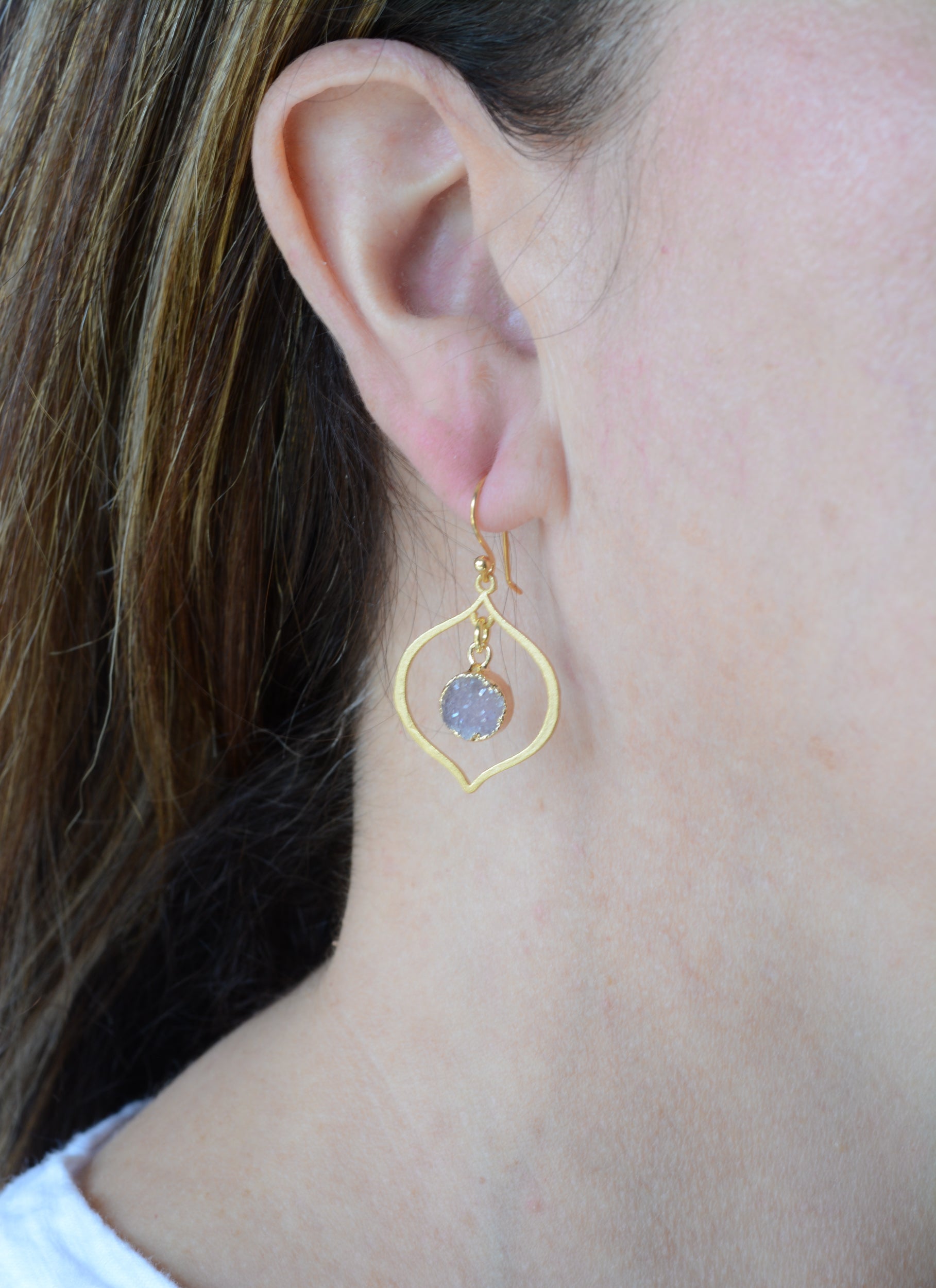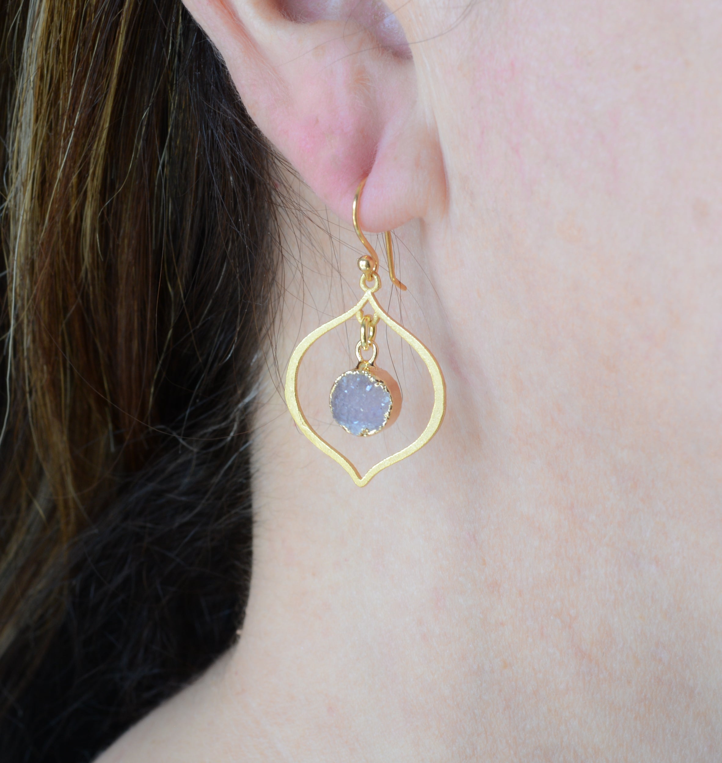 These exquisite earrings feature 22kt gold-plated sterling silver and shimmering druzy chalcedony stones. They have a graceful and lightweight feel, making them perfect for everyday wear. These earrings measure 1 1/2″ in length, and may vary slightly in color due to natural stones.