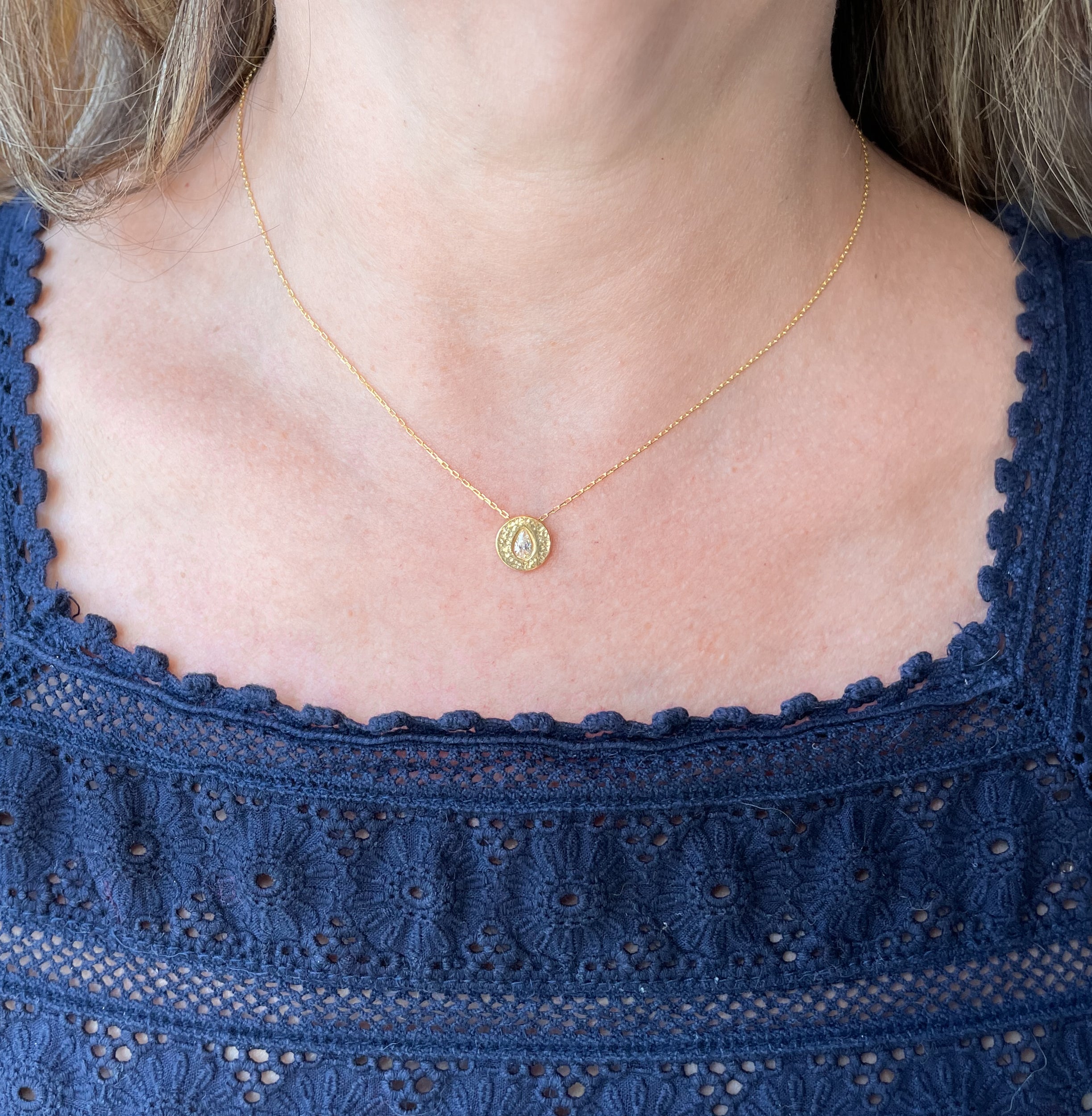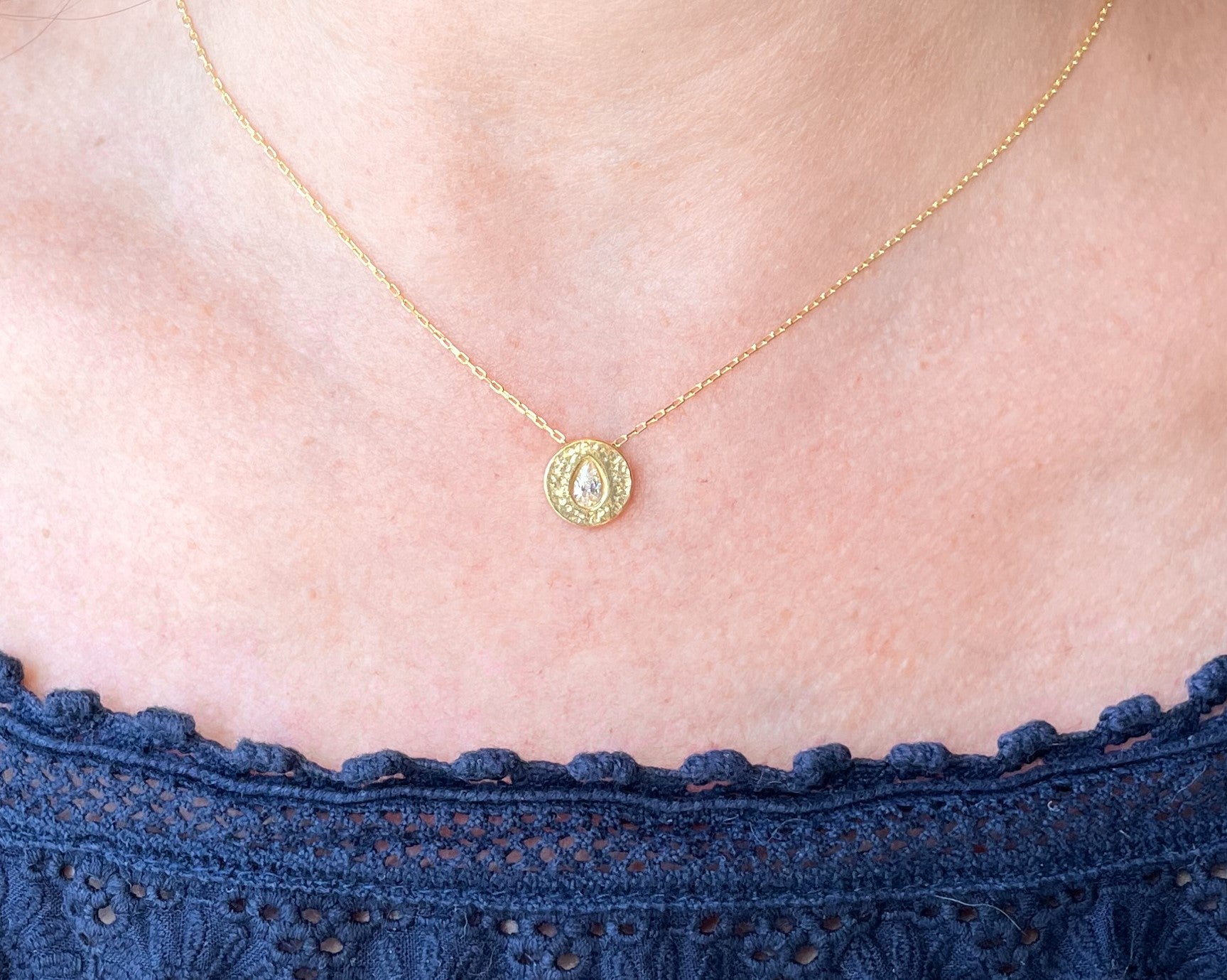 This eye catching necklace is made with sterling silver, 22kt gold plate, and a pave set cubic zirconia teardrop. Chain is adjustable from 16-18″. Pendant is approximately 1/4″. A perfect gift for any occasion, it can be worn layered, or with other pieces.