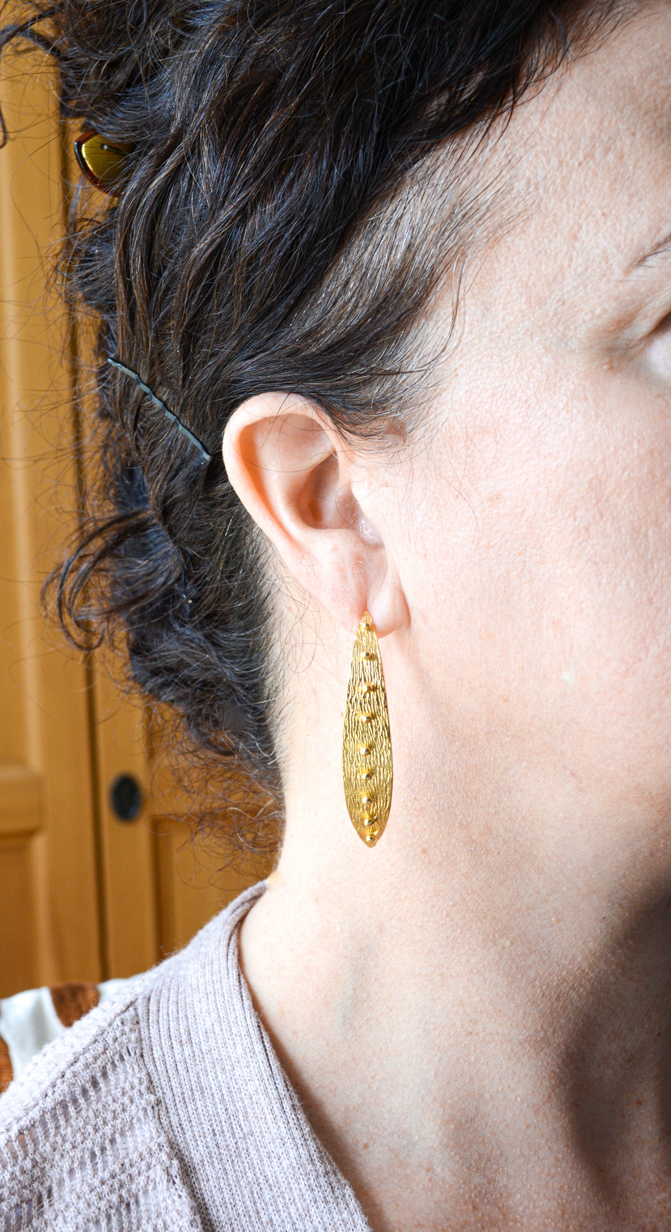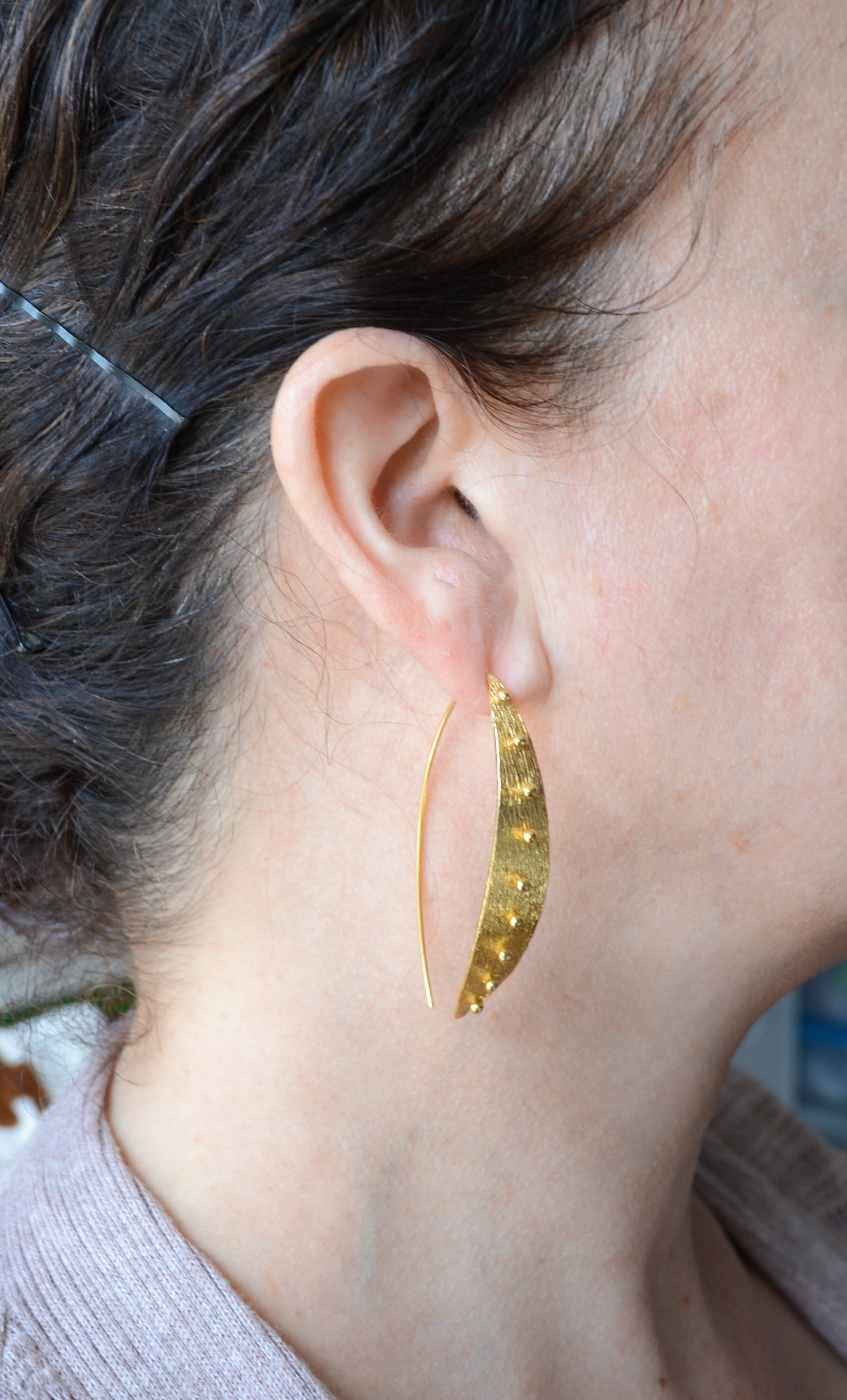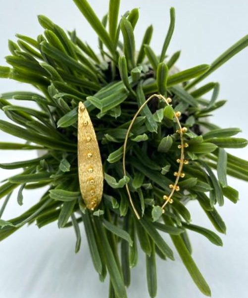 Crafted from 22 karat gold-plated brass, this beaded leaf earring is 2 inches in length.