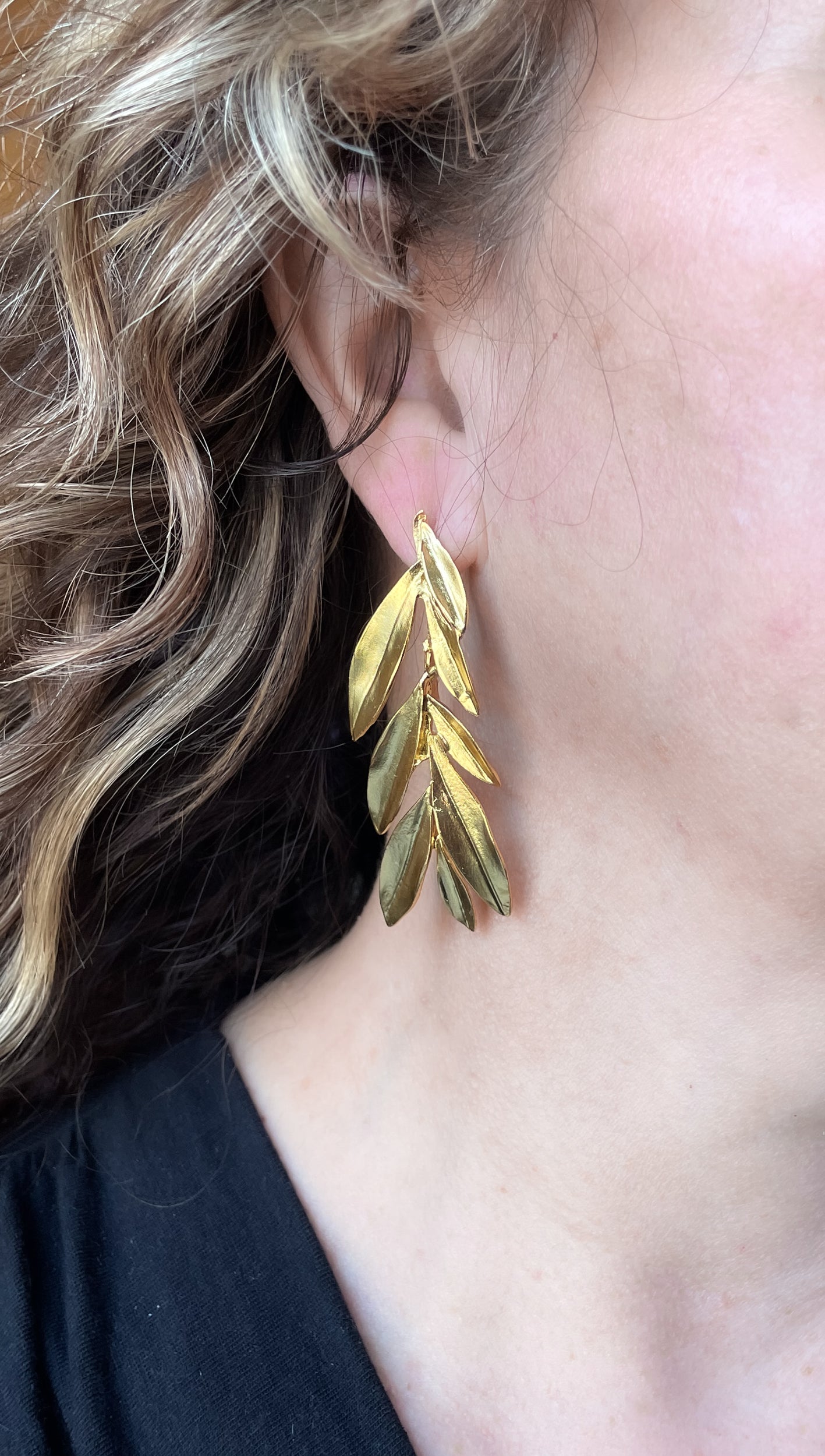These stylish vine earrings with post add an elegant touch to any outfit. Crafted with brass and finished with 22kt gold plating, with a length 2 1/2”. Perfect for formal occasions, the combination of classic materials and modern design create a timeless piece of jewelry.