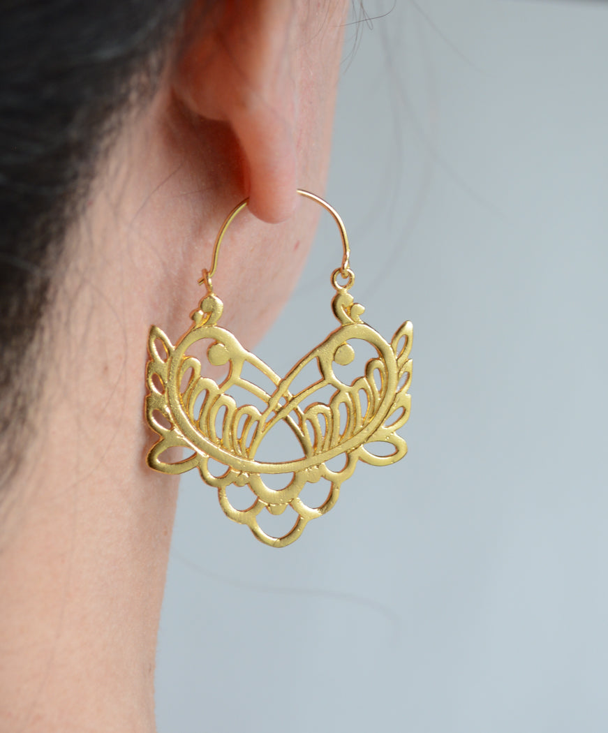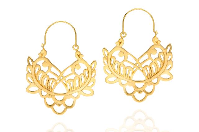These beautiful gold plated ornate filigree hoop earrings boast an intricate design and elegant motif. Crafted from brass with 22kt gold plating, each earring measures 2″ x 1 3/4″ for a lovely addition to any wardrobe.