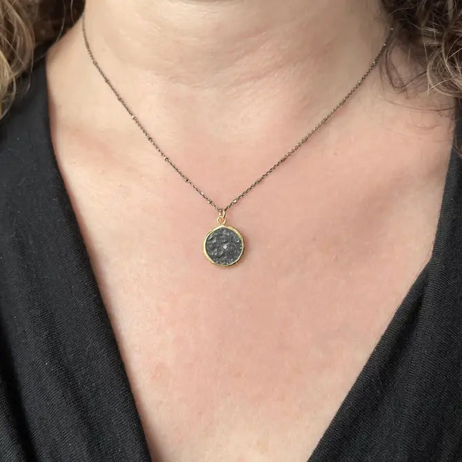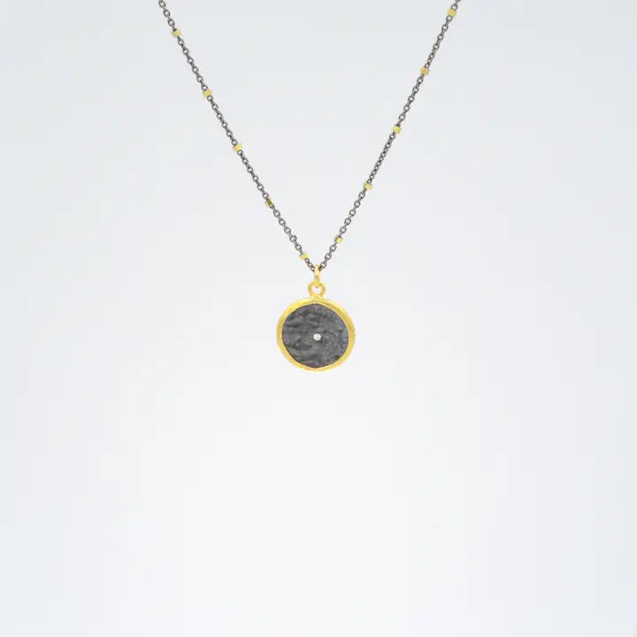 This chic mix metal necklace is crafted with 22kt gold-plated silver and bronze, featuring a cubic zirconia accent. It hangs on a 16″ 2 tone dark rhodium beaded chain, with a pendant diameter of 1/2″.