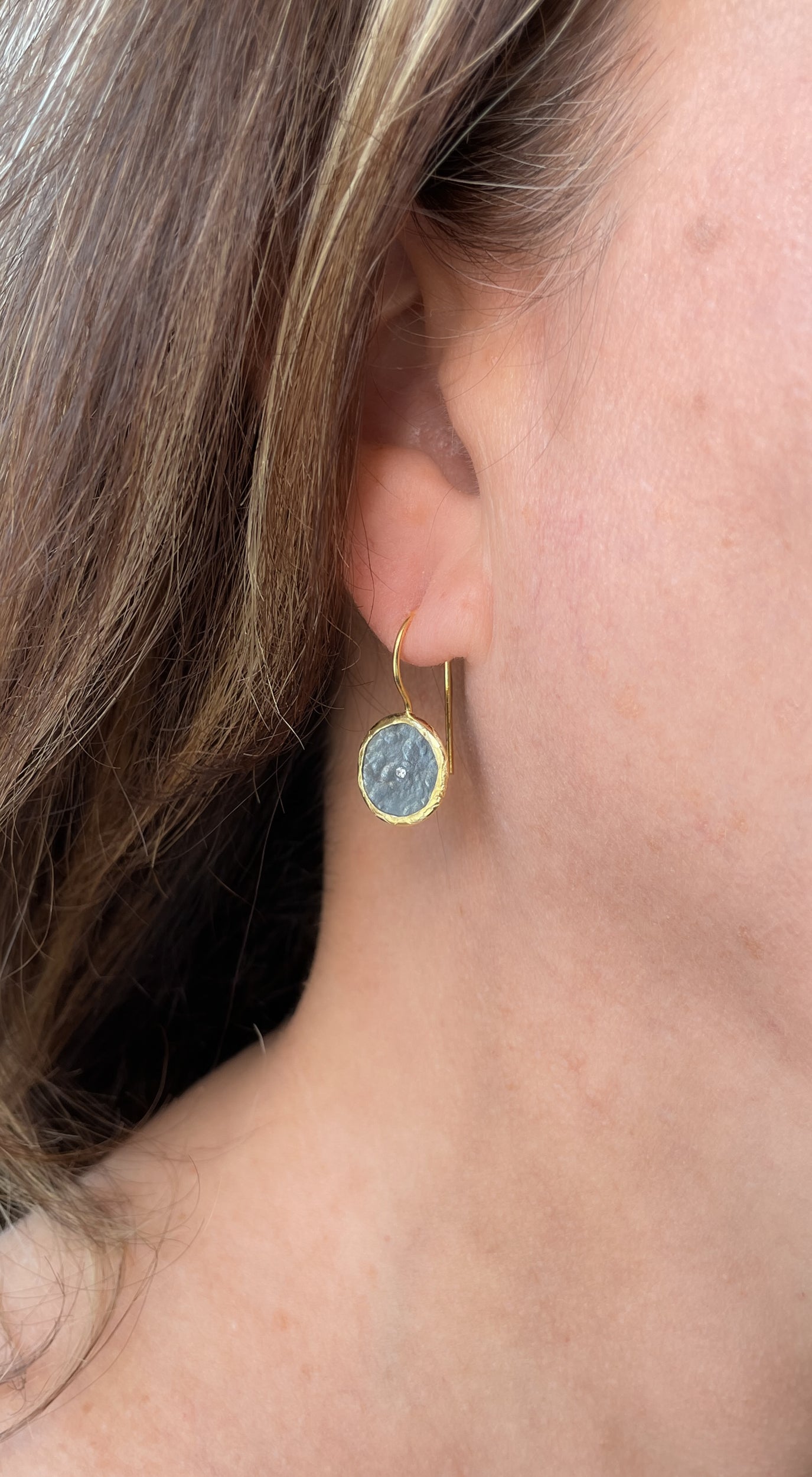 Elevate your style with our Mix metal disc earrings. Crafted from 22kt gold-plated silver and bronze, these stunners will turn heads and blind with the sparkling cubic zirconia accents. Measuring 1/2″ wide and 1″ long, they add the perfect touch of bling to any outfit. Prepare to wow them all.