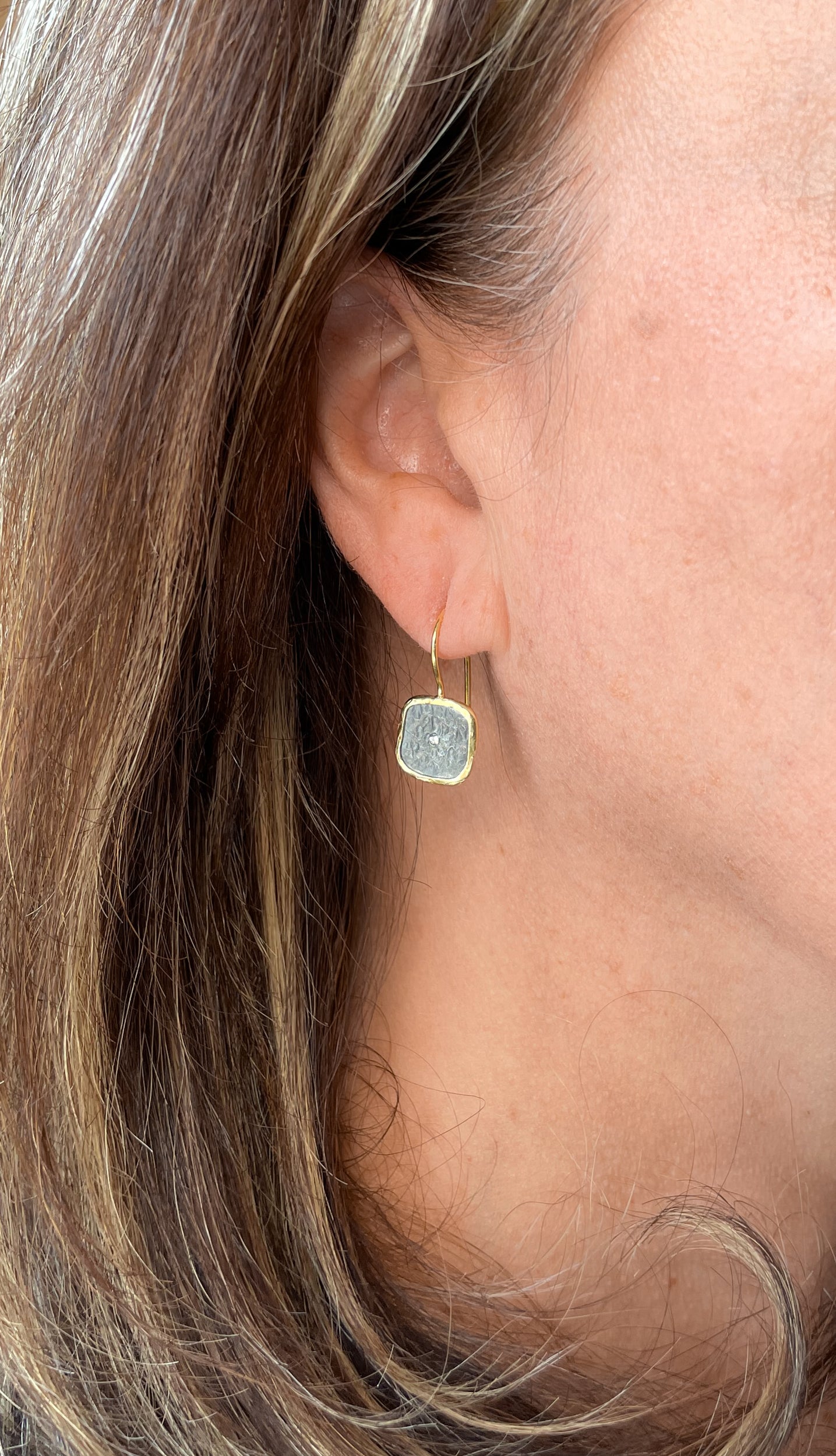 These attractive mix metal earrings are constructed with 22 karat gold plated silver and bronze, and contain cubic zirconia details. They measure approximately 1/2 inch wide and 1 inch long.