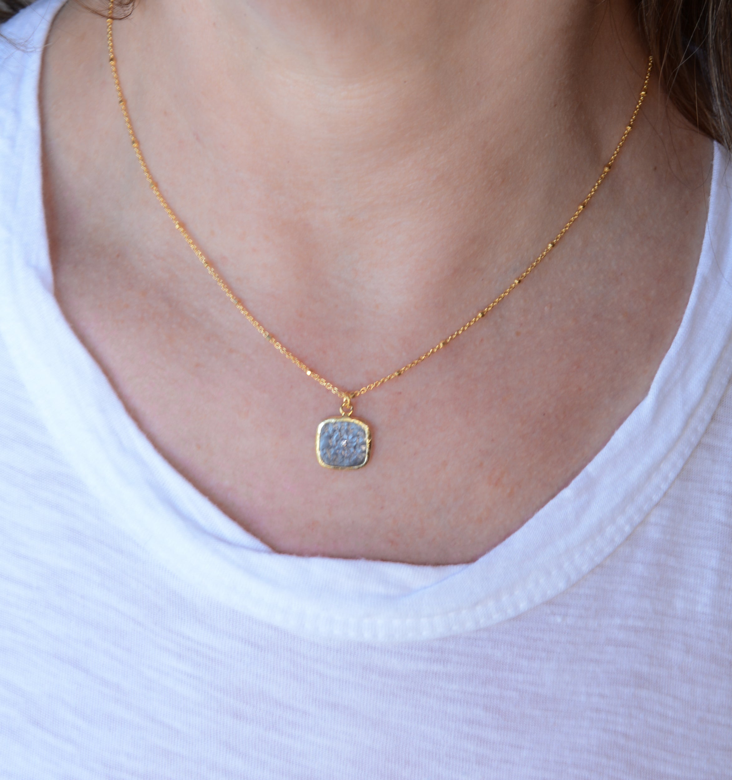 Crafted with 22kt gold-plated silver, this sought-after mixed metal necklace features a bronze pendant adorned with cubic zirconia accents. It hangs elegantly on a 16″ beaded chain, and the pendant itself measures approximately 1/2″ in length.