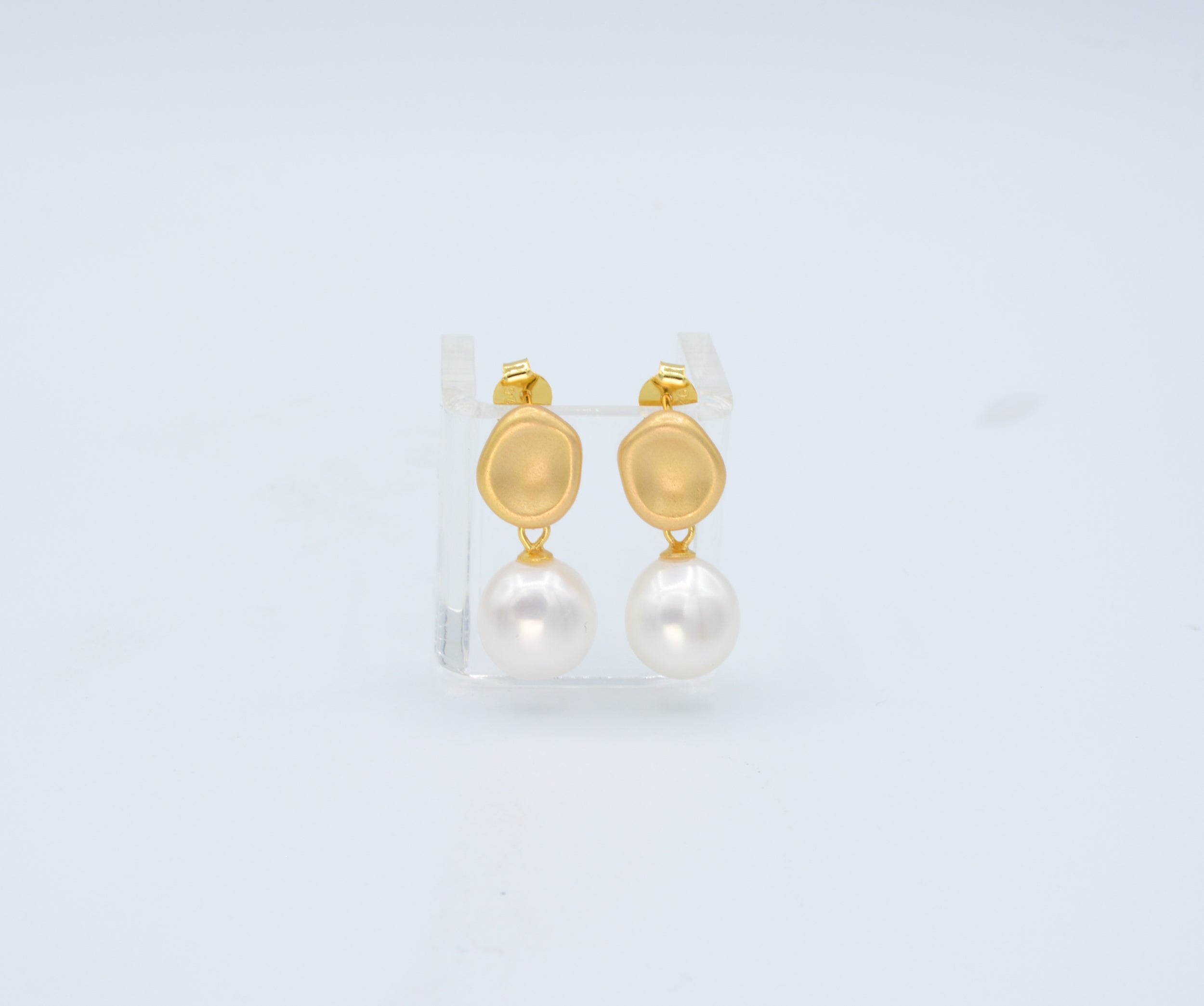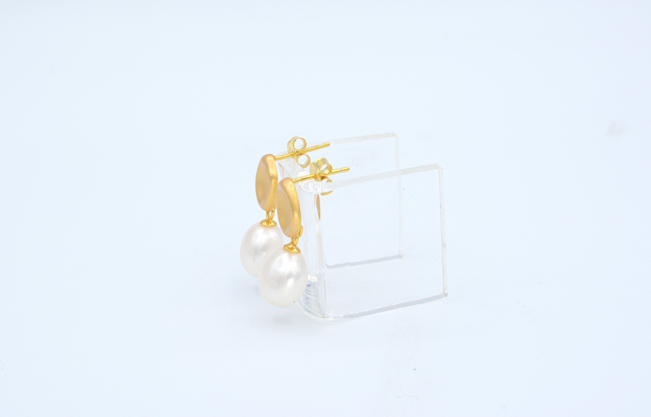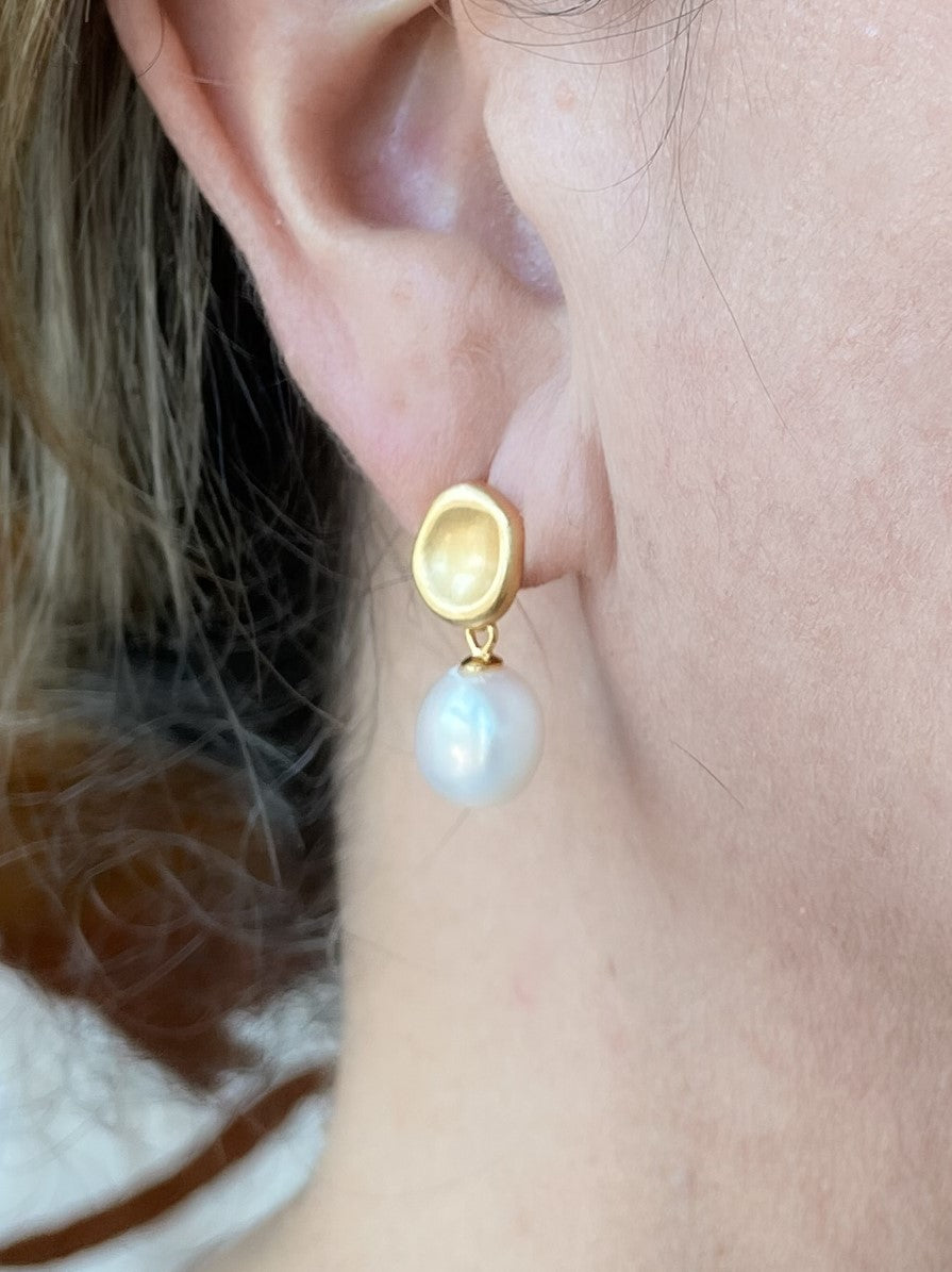 Our classic, and sophisticated genuine pearl earrings are sure to be a customer favorite, Crafted of sterling silver with 14kt gold plate and a matte finish. Approximately 3/4″ long.