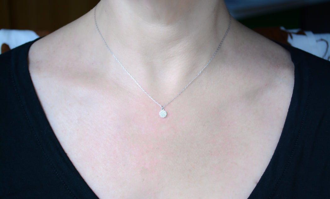 This dainty and delicate disc necklace is made with sterling silver and pave set cubic zirconia, and plated with rhodium. Charm is 1/4″ wide, necklace is adjustable 16-18″.