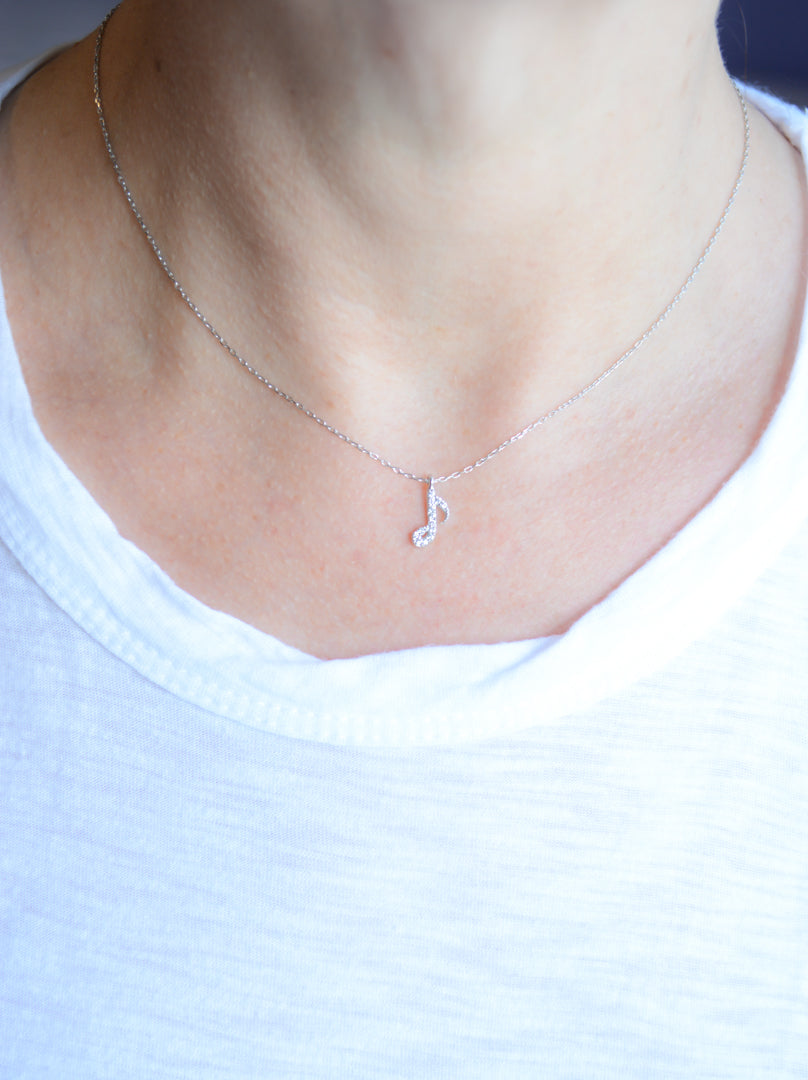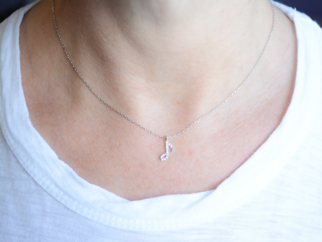 Show off your love of music with this exquisite sterling silver necklace featuring a shimmering cubic zirconia music note charm. The handcrafted piece is finished with rhodium plating and a fine 16-18″ adjustable chain, making it the perfect accessory for any music aficionado.