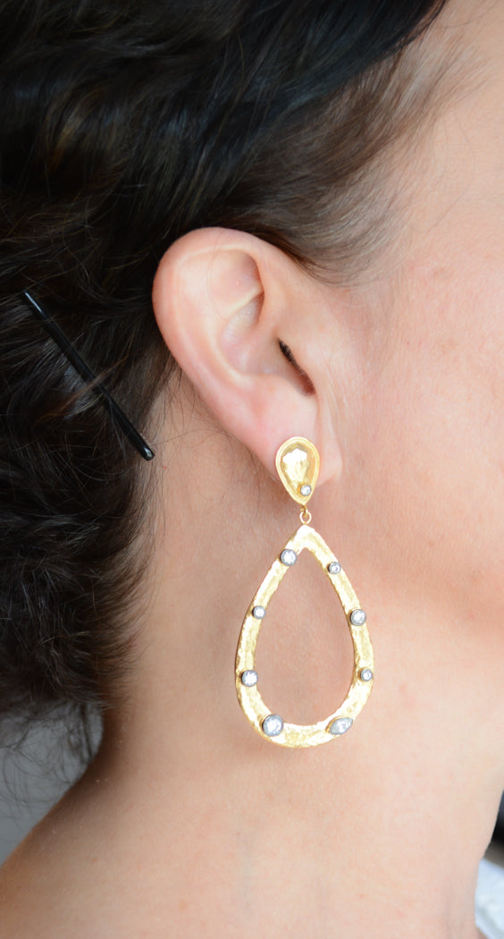 Transform any outfit into a statement with our luxurious hammered teardrop earrings. Crafted with 22kt gold plated brass and embellished with sparkling cubic zirconia accents in oxidized settings, these earrings are 2 3/4″ long and 1 1/4″ wide.