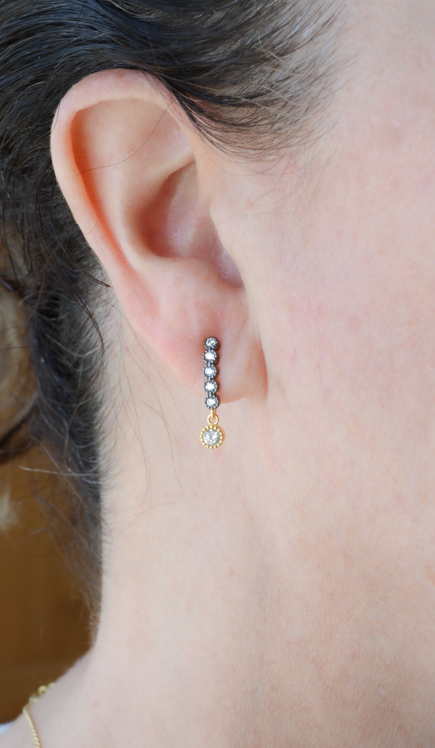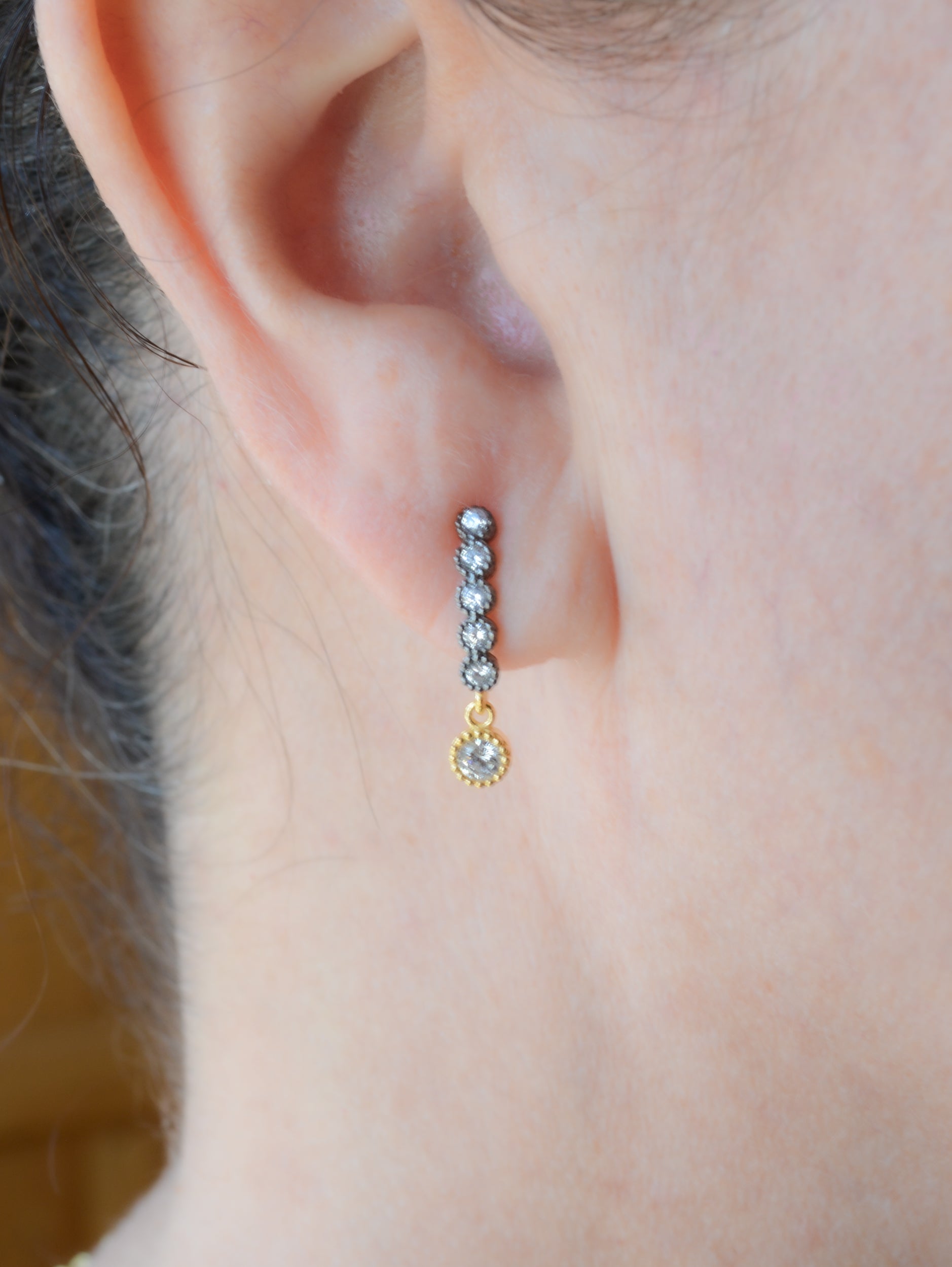 Two-tone finish creates a great rich look. Sterling silver with 22k gold and dark rhodium plating. Very lightweight. For daily wear, or special occasions. 5/8″ length.
