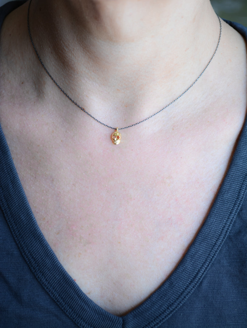 Always popular, our 3D skull necklace is a classic piece. Made with sterling silver, oxidized chain and 22k gold plated charm. 16″+2″ length. A great layering piece, this necklace will give a stylish edge to your look.