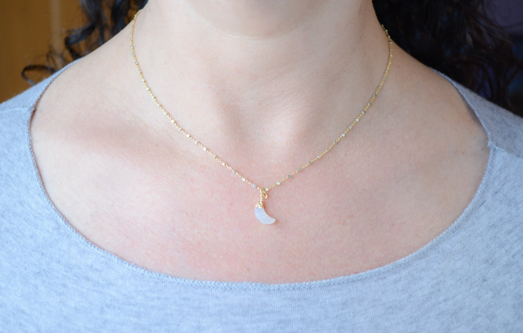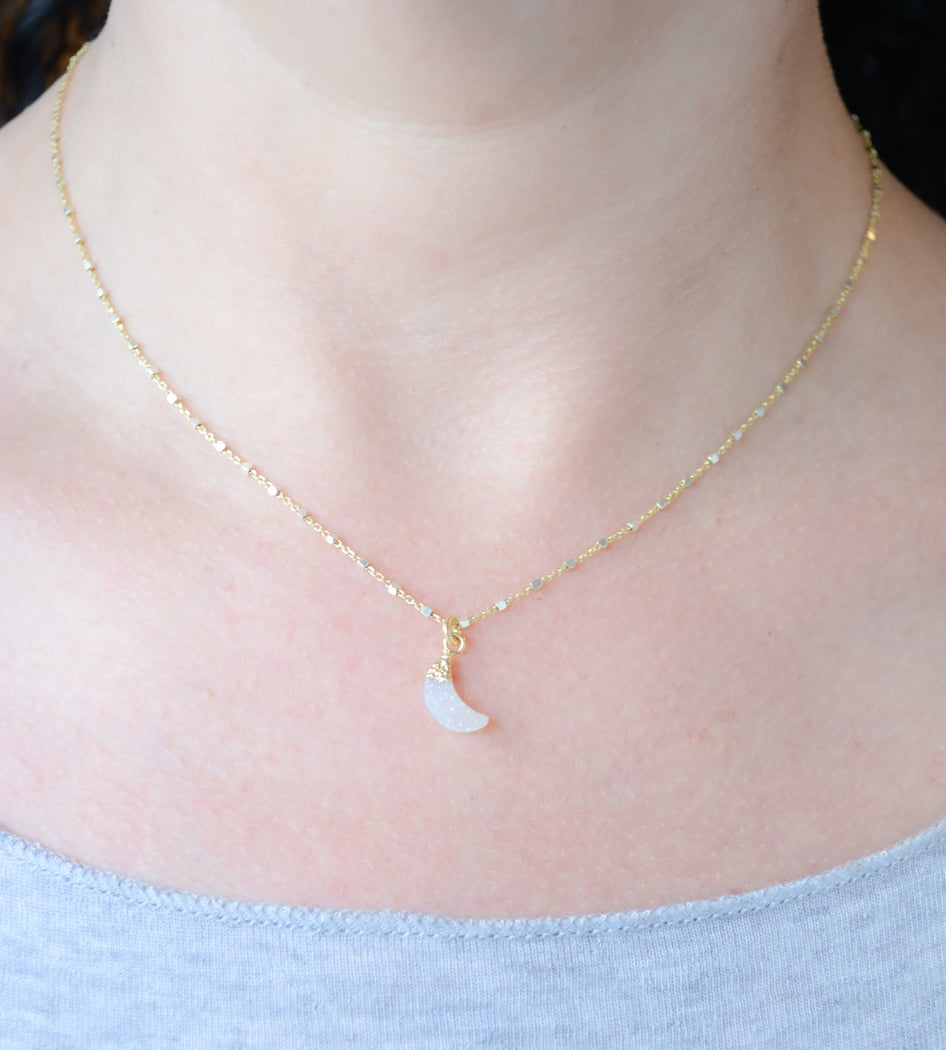 Our tiny white druzy crescent moon pendant on 2 tone sterling silver and 22kt gold plate chain is minimalist chic. Adjustable 16-18″. Pendant is 1/2″.